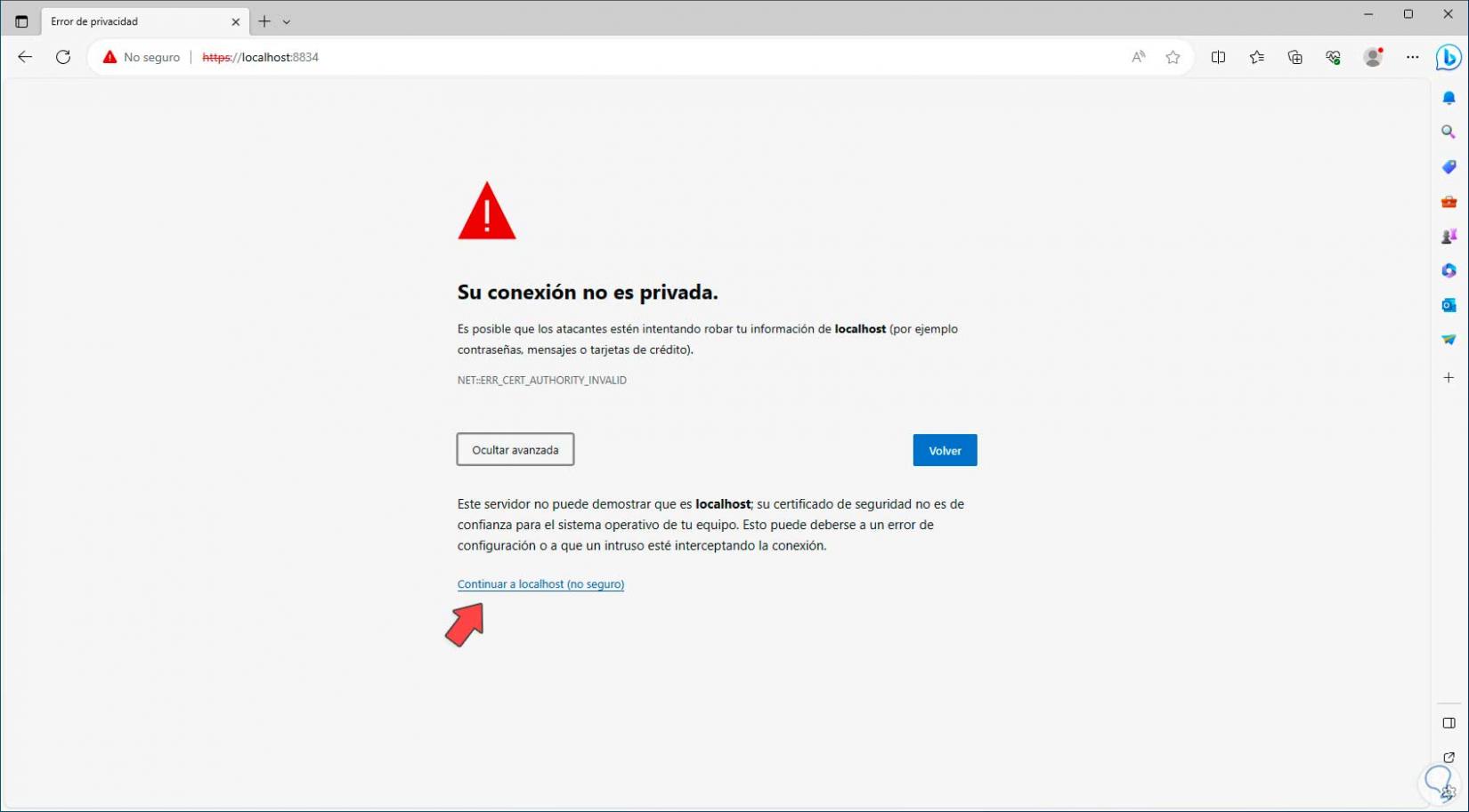 Allí damos clic en “Connect via SSL”, luego un mensaje de error, damos clic en “avanzado” y luego damos clic en “Continuar a localhost”: