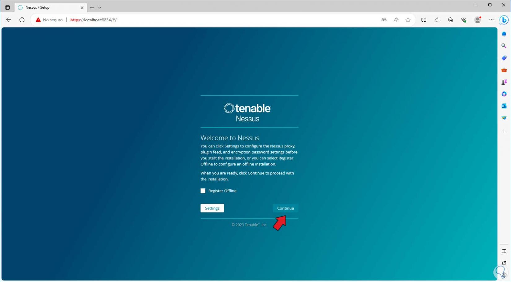 Veremos lo siguiente de Nessus. Aquí damos clic en “Continue”: