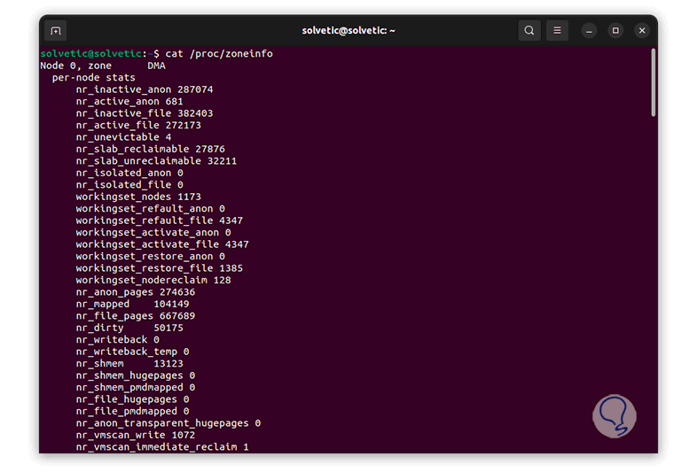 Otra opción a usar es ver la información de las zonas de memoria, con este resultado será posible analizar el comportamiento de la memoria virtual, podemos usar el comando: