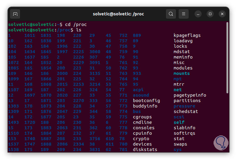 Es posible tener acceso a una lista completa de los archivos y directorios en el sistema de archivos /proc, para ello haremos uso del siguiente comando: