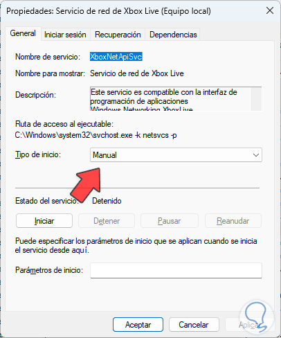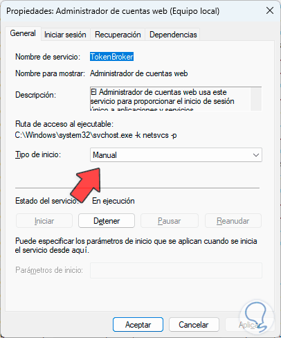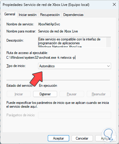 En el campo “Tipo de inicio” establecemos el valor “Automático”. Aplicamos los cambios.
