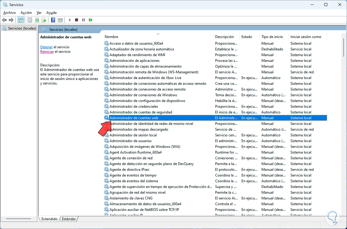 Aplicamos los cambios. Este servicio es compatible con la interfaz de programación de aplicaciones Windows.Networking.XboxLive y su tarea es permitir que todos los procesos de red de Xbox funcionen de forma correcta. Finalmente, seleccionamos el servicio llamado “Administrador de cuentas web”: