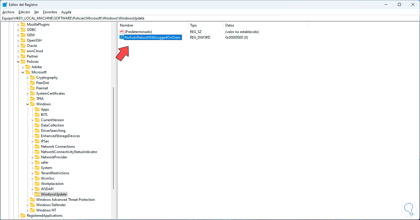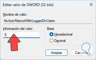 A este valor le asignamos el nombre “NoAutoRebootWithLoggedOnUsers”: