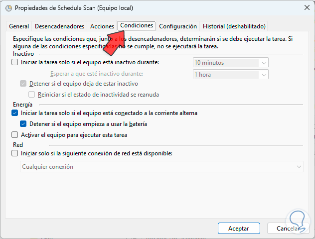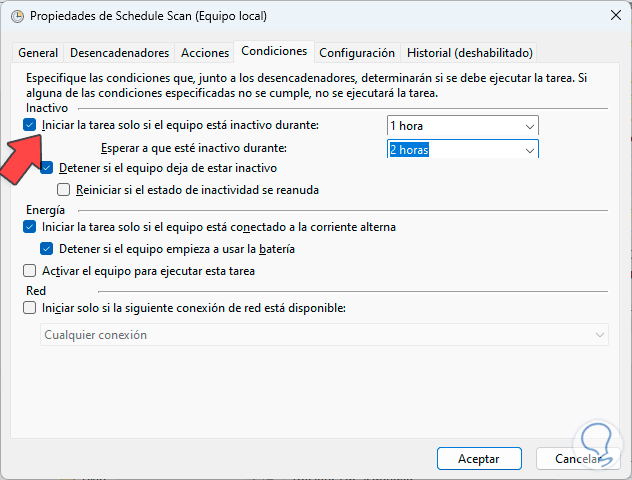 Aquí vamos a activar la casilla “Iniciar la tarea solo si el equipo esta inactivo durante” y luego definimos los valores más altos: