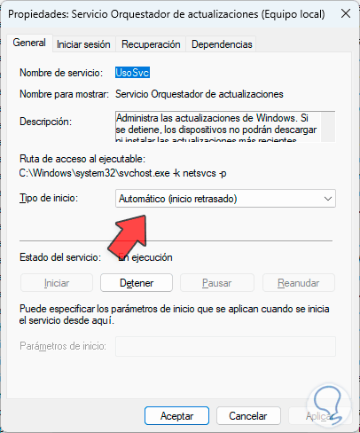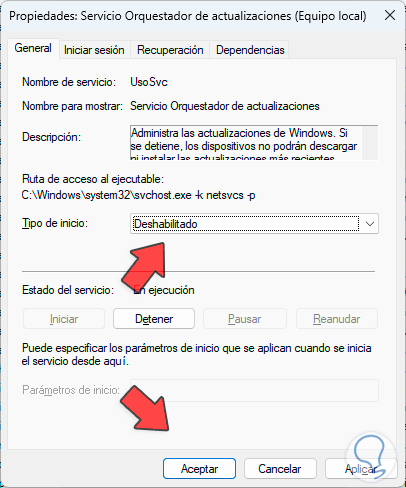 En el campo “Tipo de inicio” seleccionamos “Deshabilitado”. Este servicio se encarga de administrar las actualizaciones de Windows 11, por ello al deshabilitarlo, evitaremos el reinicio automático.