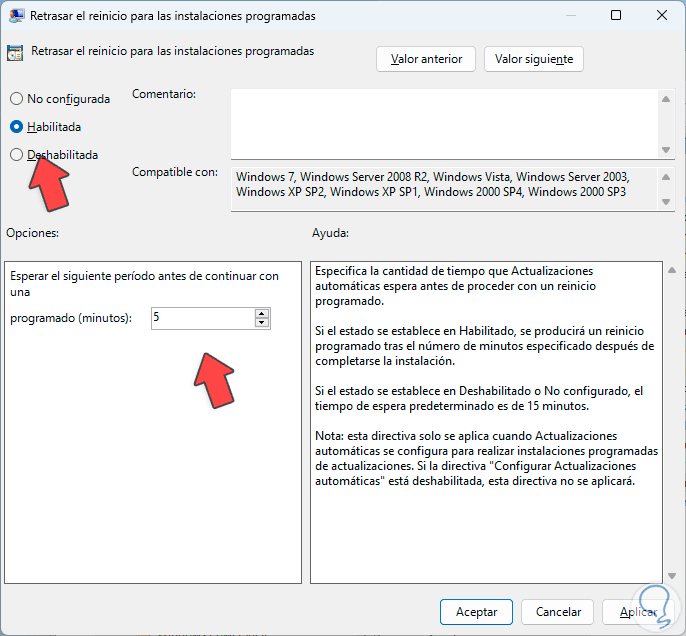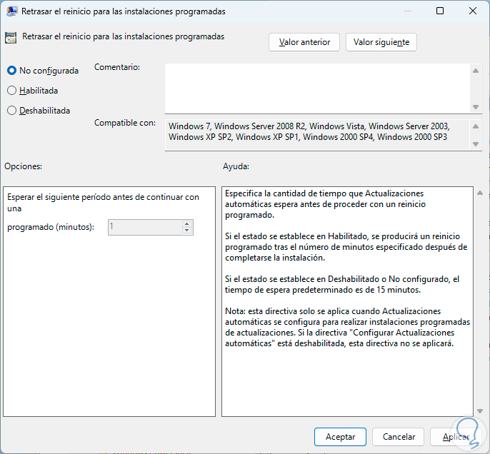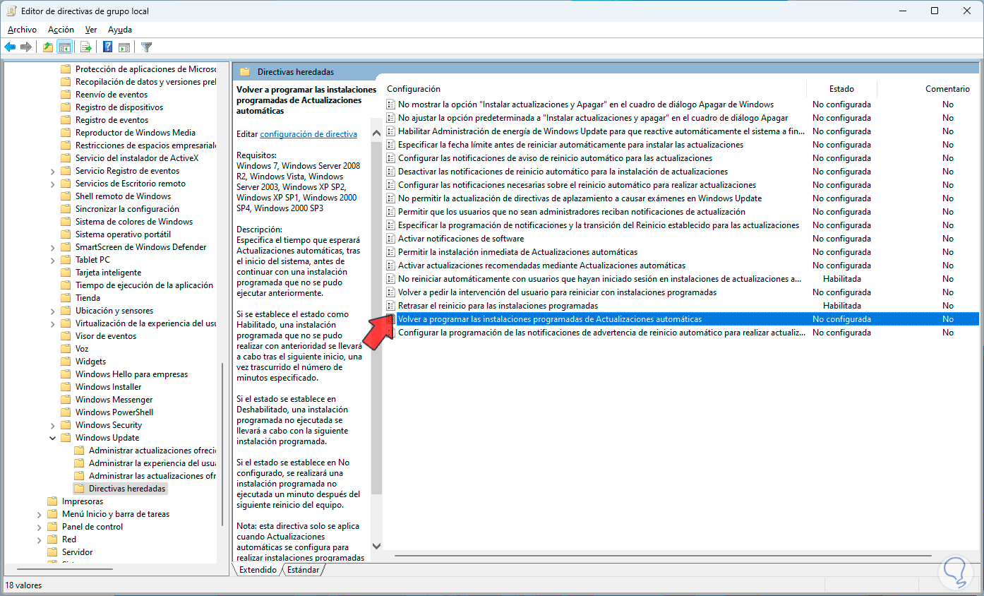 Esta política permite determinar la cantidad de tiempo para que las actualizaciones automáticas puedan usar un reinicio programado. Ahora, seleccionamos la política “Volver a programar las instalaciones programadas de Actualizaciones automáticas”: