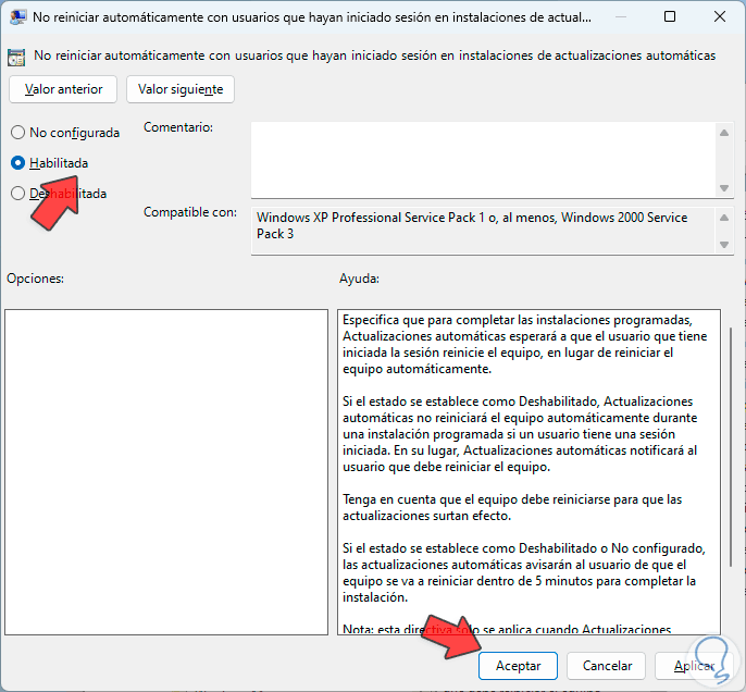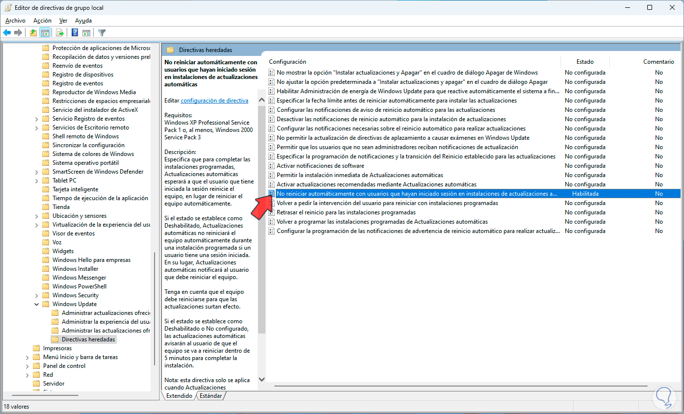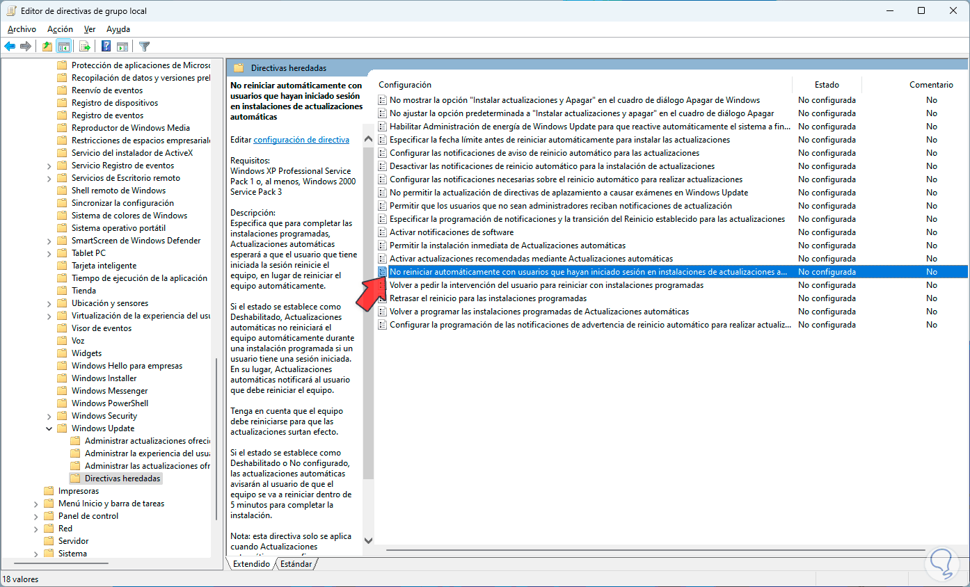 En primer lugar vamos a seleccionar la política “No reiniciar automáticamente con usuarios que hayan iniciado sesión en instalaciones de actualizaciones automáticas”: