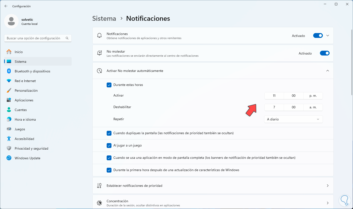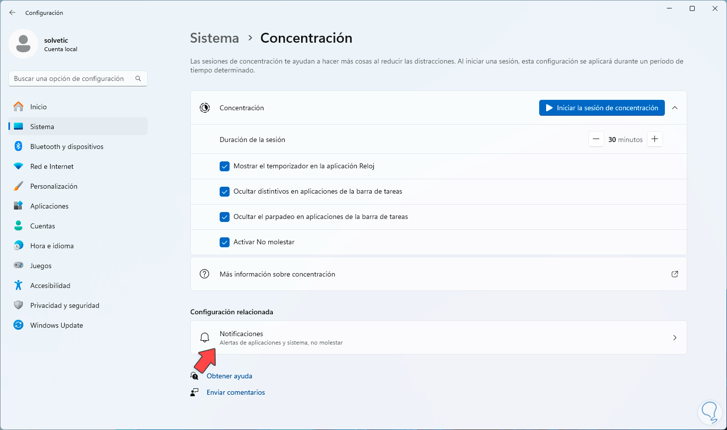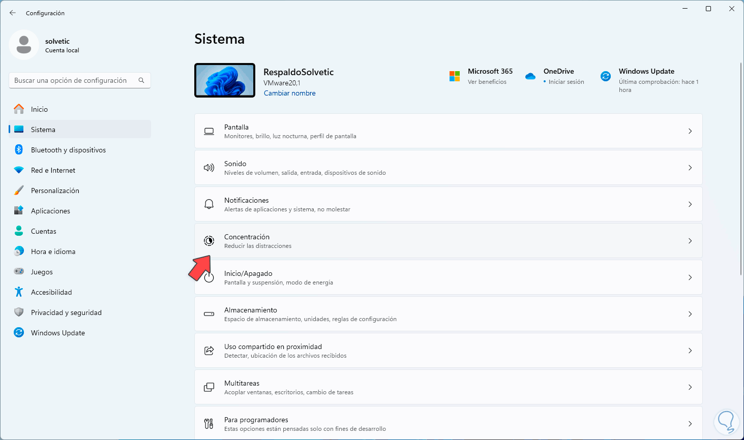 Ahora vamos a “Sistema” y allí damos clic en “Concentración”: