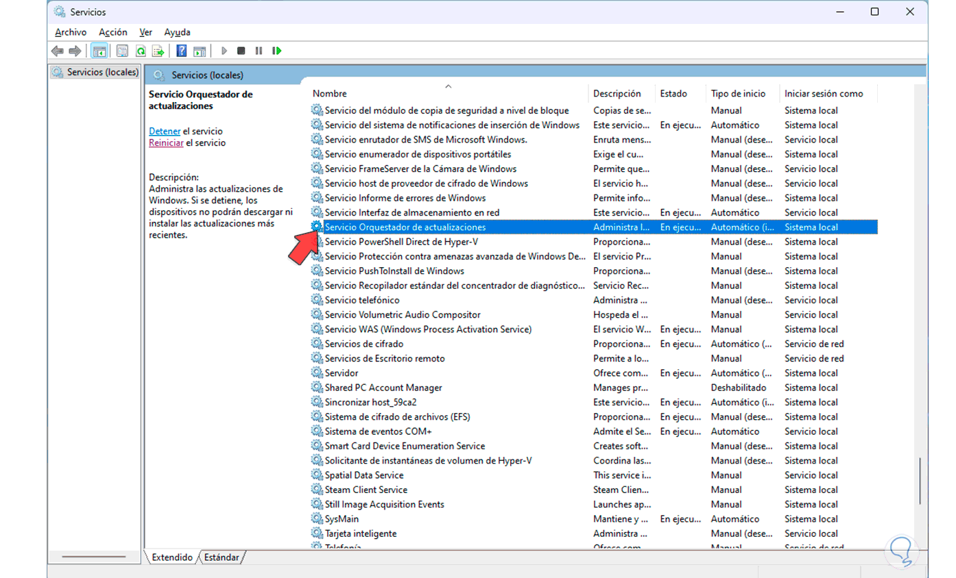 Damos clic en “Servicios”, allí vamos a seleccionar “Servicio orquestador de actualizaciones”: