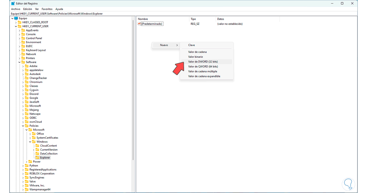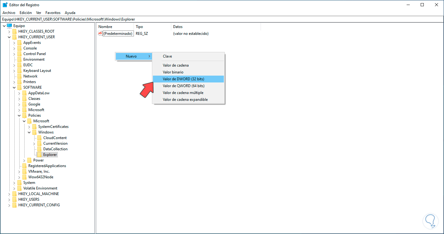 Ahora, con Explorer seleccionada, damos clic derecho en algún lugar y seleccionamos “Nuevo – Valor de DWORD (32 bits)”: