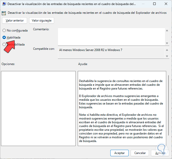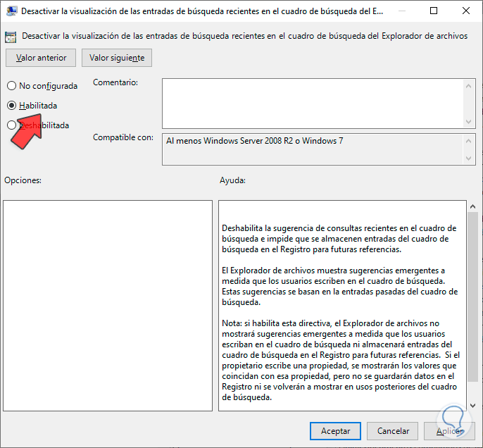 Damos doble clic sobre ella para ver su estado. Activamos la casilla “Habilitada”. Damos clic en “Aplicar” y “Aceptar”: