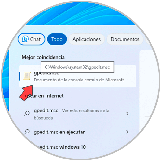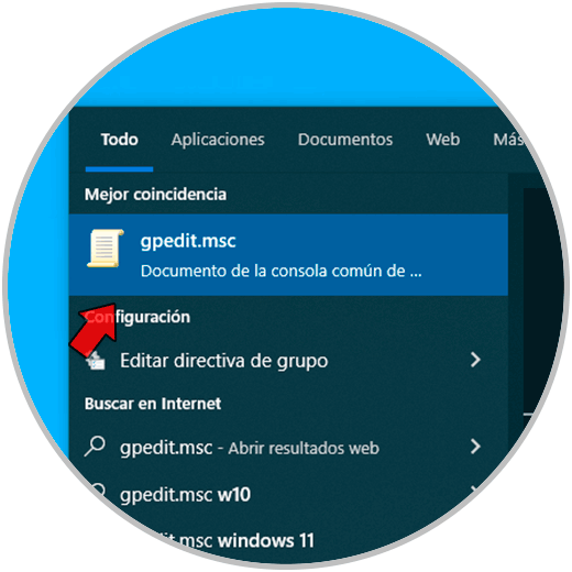 En el buscador ingresamos “gpedit.msc” y abrimos la utilidad: