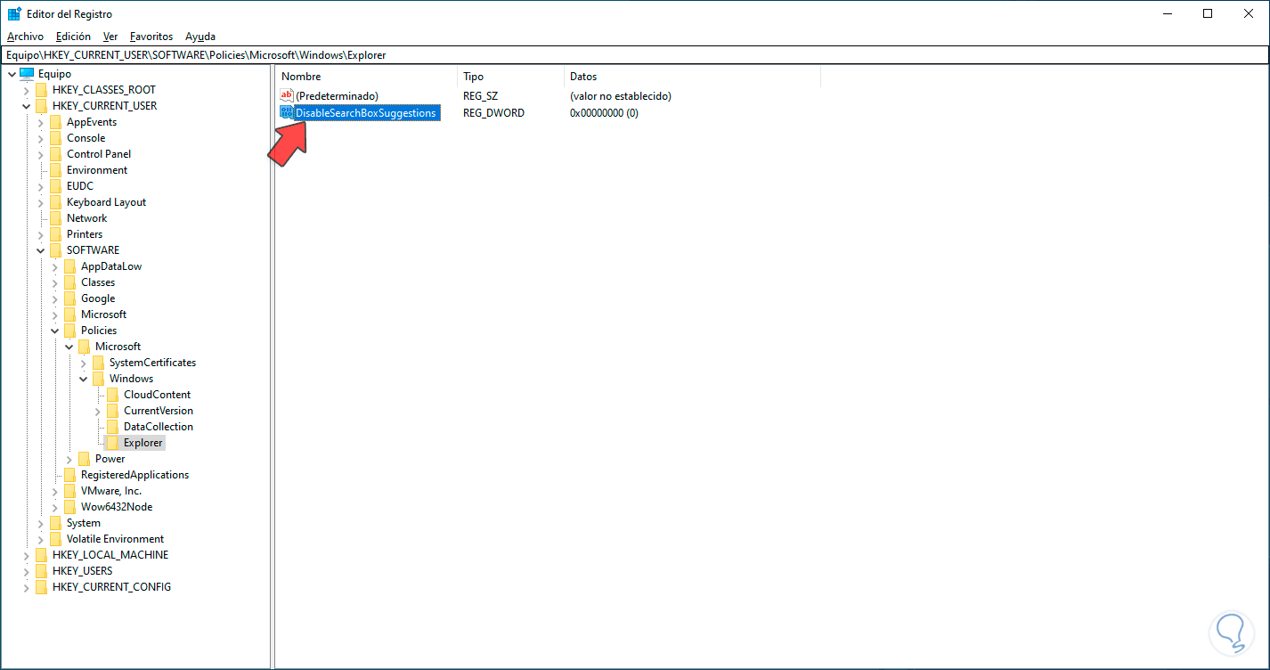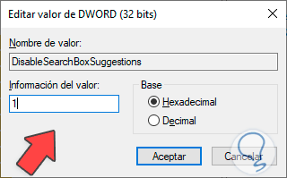 Este valor llevará el nombre “DisableSearchBoxSuggestions”: Damos doble clic sobre el valor para ver sus propiedades: