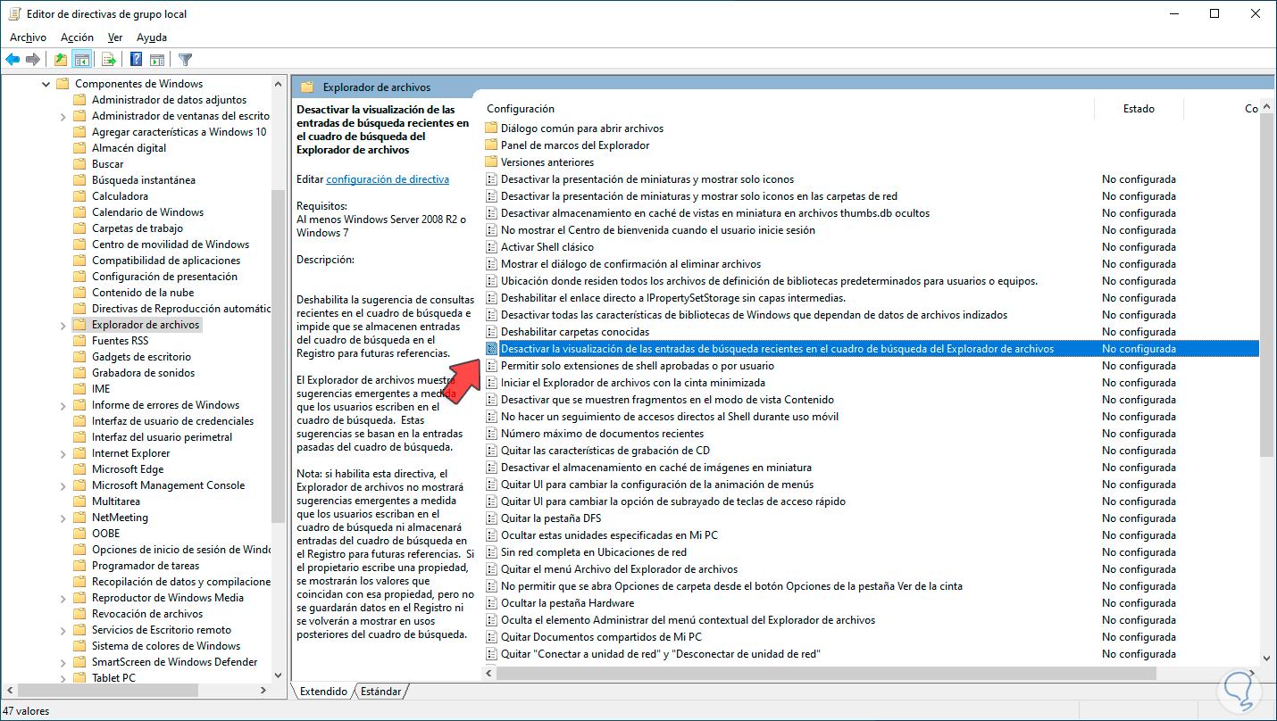 Allí vamos a seleccionar la política llamada “Desactivar la visualización de las entradas de búsqueda recientes en el cuadro de búsqueda del Explorador de archivos”: