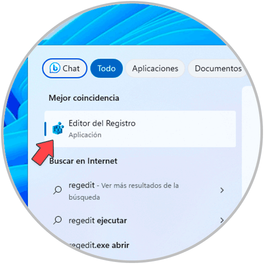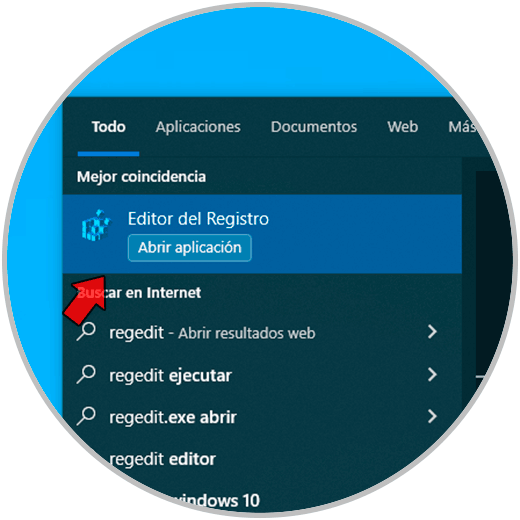Ahora, en el mismo cuadro de búsqueda ingresamos “regedit” y damos clic en el Editor de registros: Aceptamos los permisos de UAC: