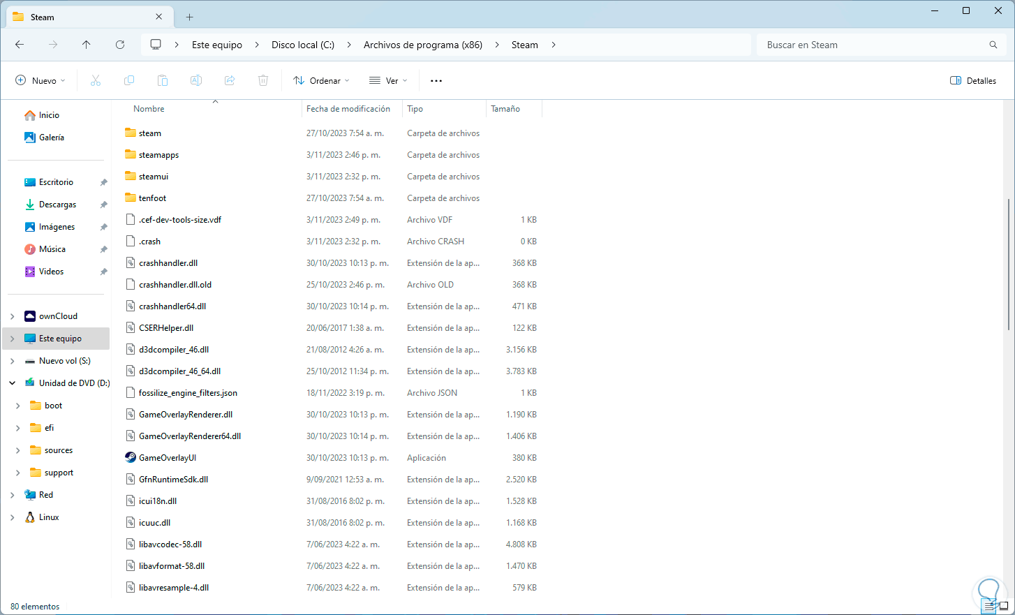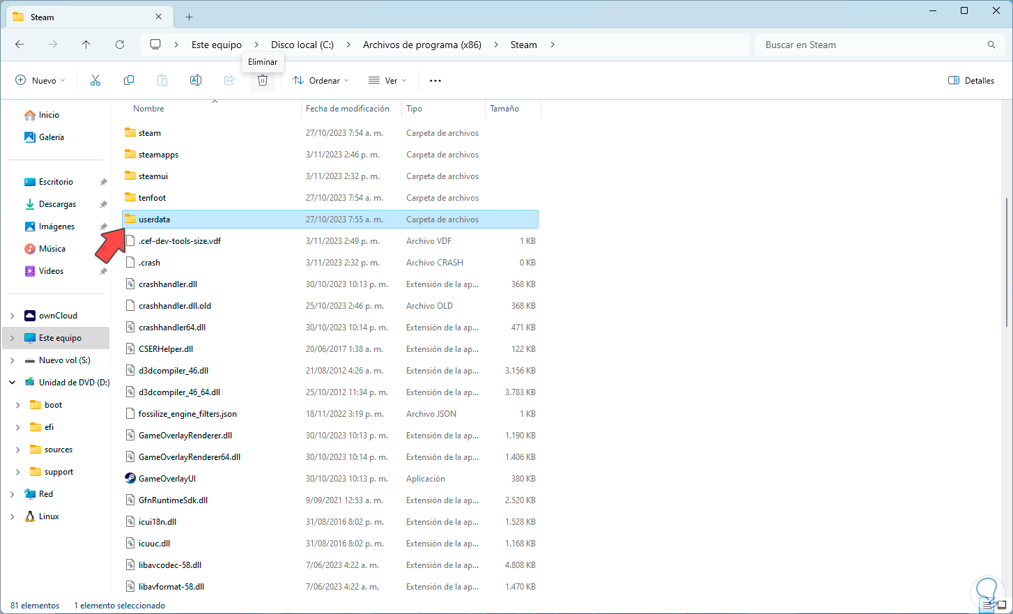 Una vez seleccionada damos clic en “Eliminar” para borrarla. Abrimos Steam.