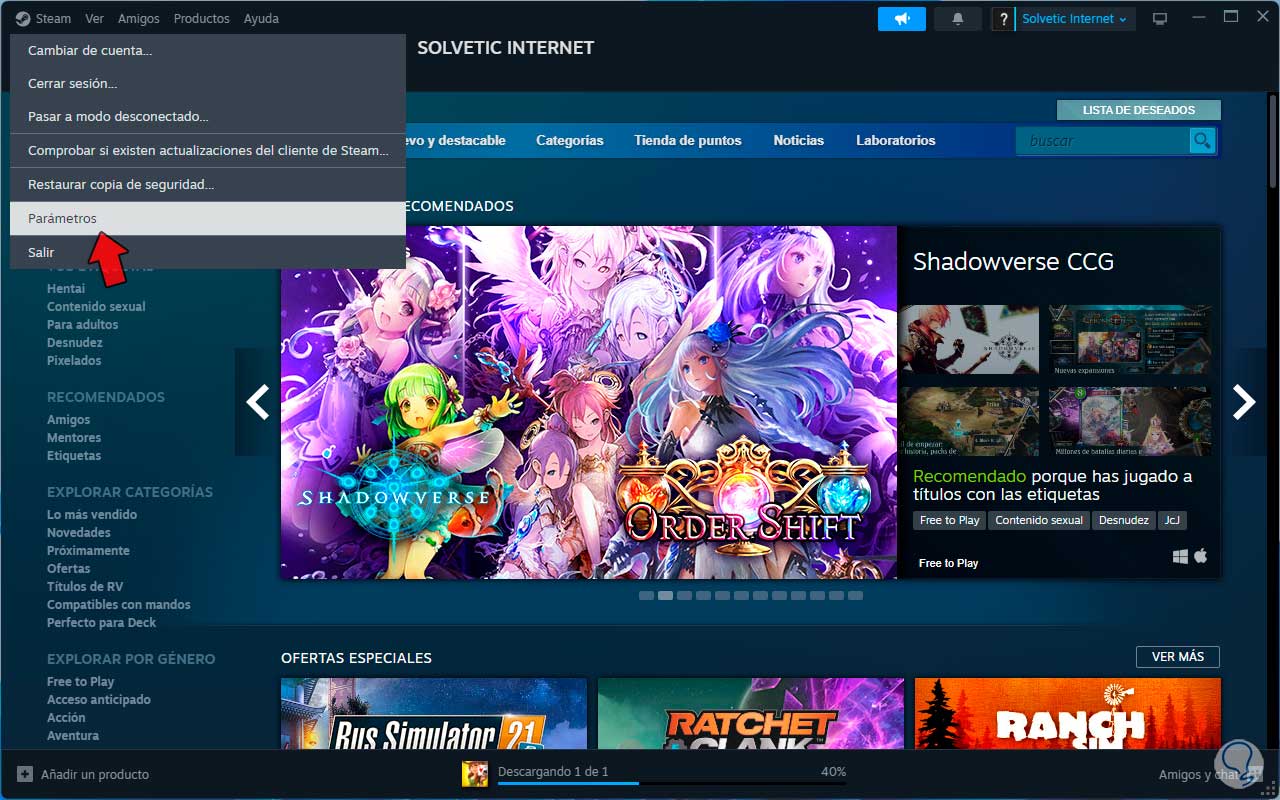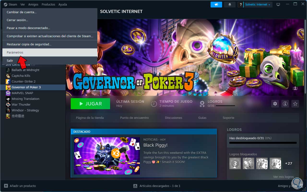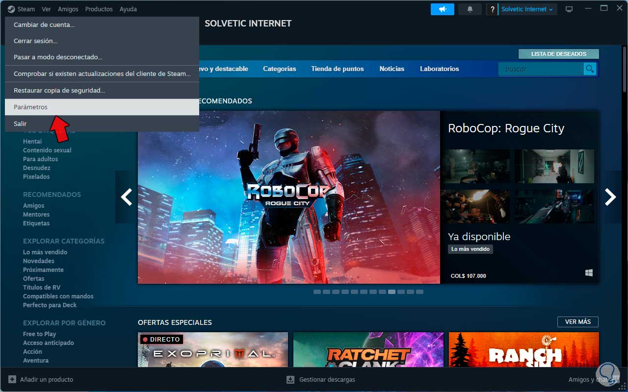 Para comp1robar esto, abrimos Steam y en el menú Steam damos clic en “Parámetros”:
