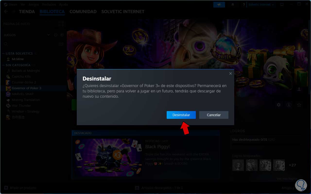 Veremos el siguiente mensaje. Damos clic en “Desinstalar” para confirmar este proceso y esperamos que el juego sea eliminadode la biblioteca: