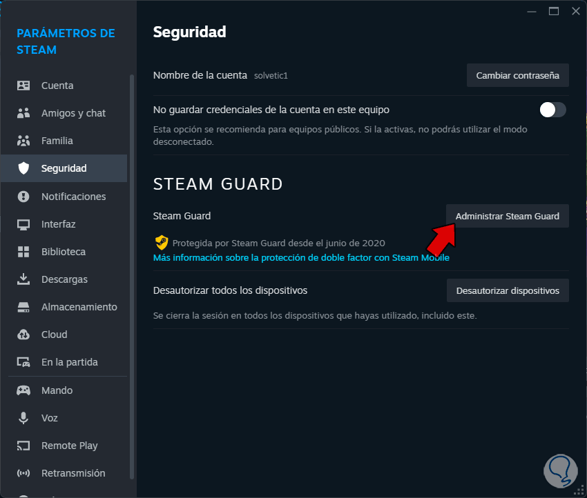 Después de esto, vamos a la sección “Seguridad” y damos clic en “Administrar Steam Guard”:
