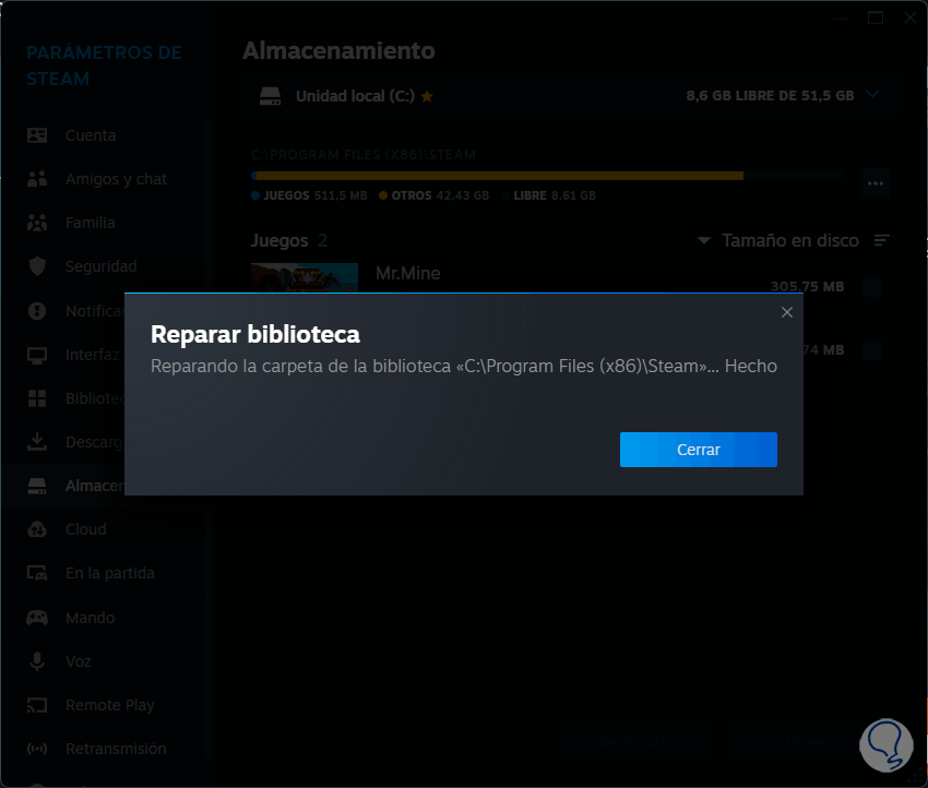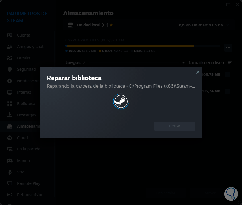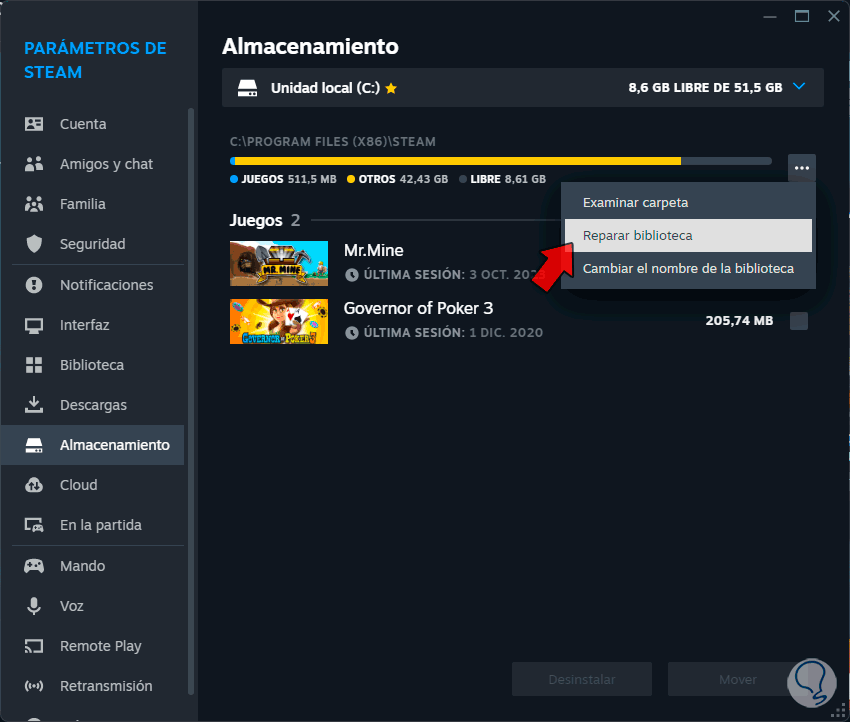 Luego, en la sección “Almacenamiento”, damos sobre los 3 puntos en la ruta de instalación y seleccionamos la opción “Reparar biblioteca”: