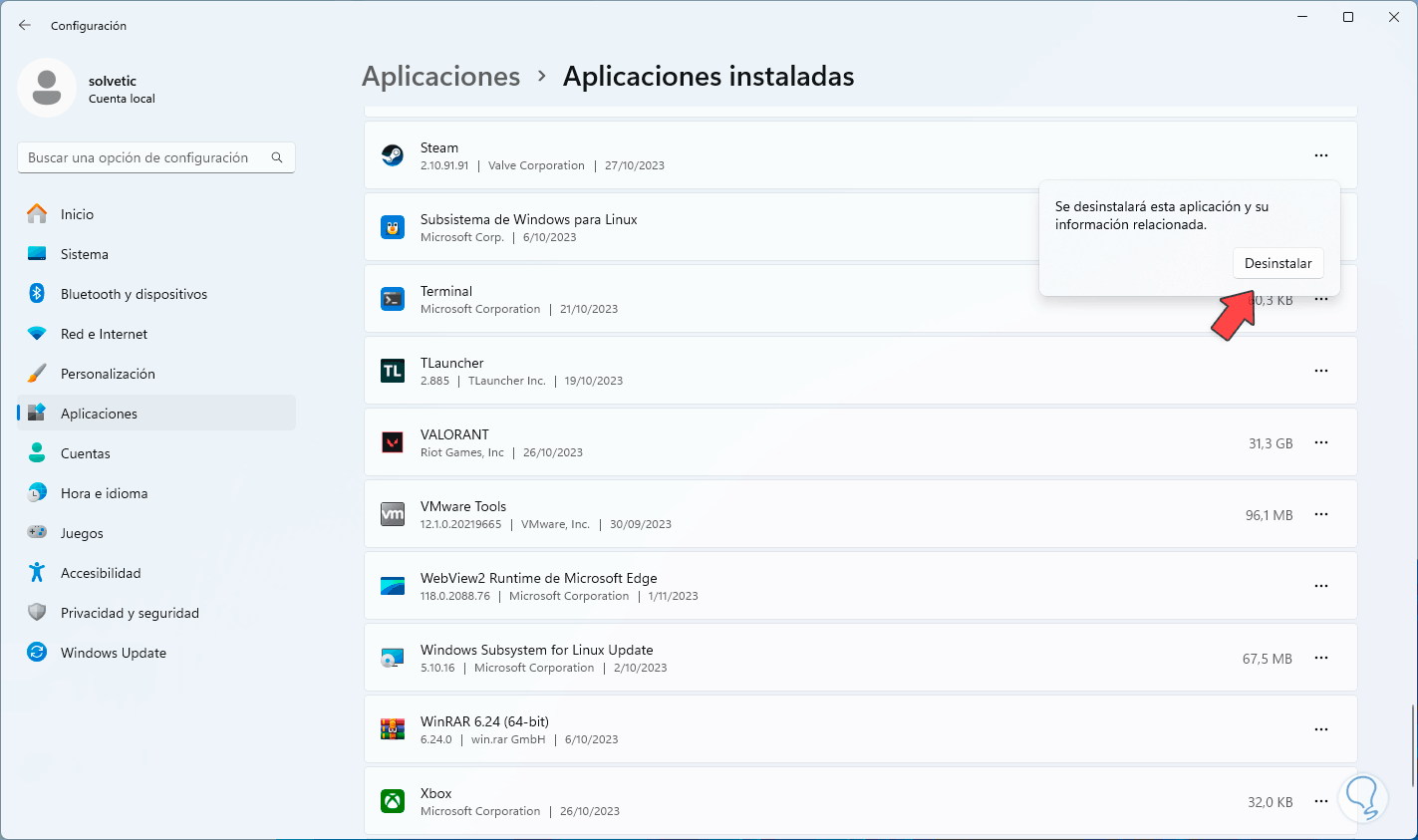 Al dar clic allí debemos confirmar de nuevo dando clic en “Desinstalar”: