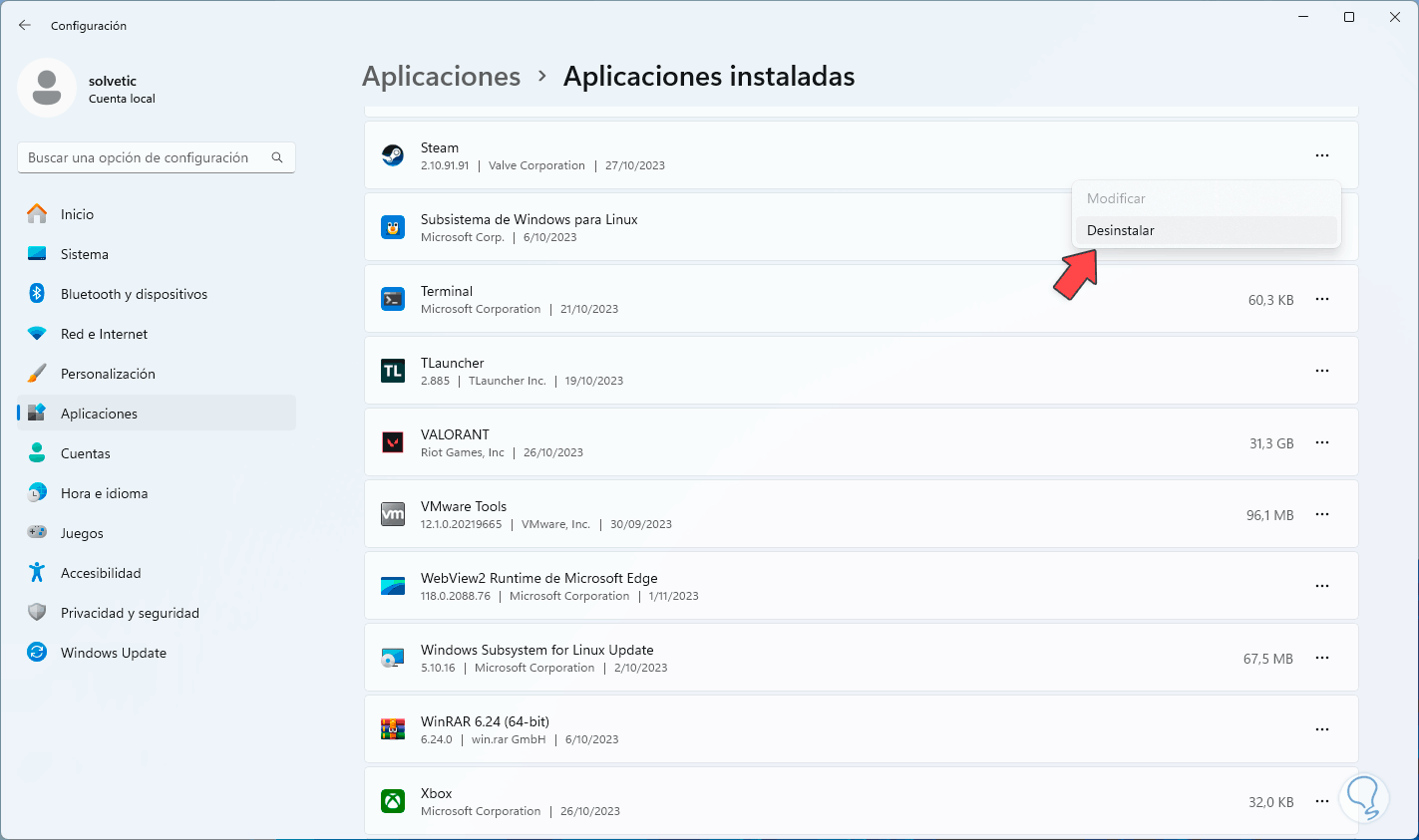 Allí damos clic en “Aplicaciones instaladas, luego, buscamos Steam, damos clic en el menú contextual y damos clic en “Desinstalar”.