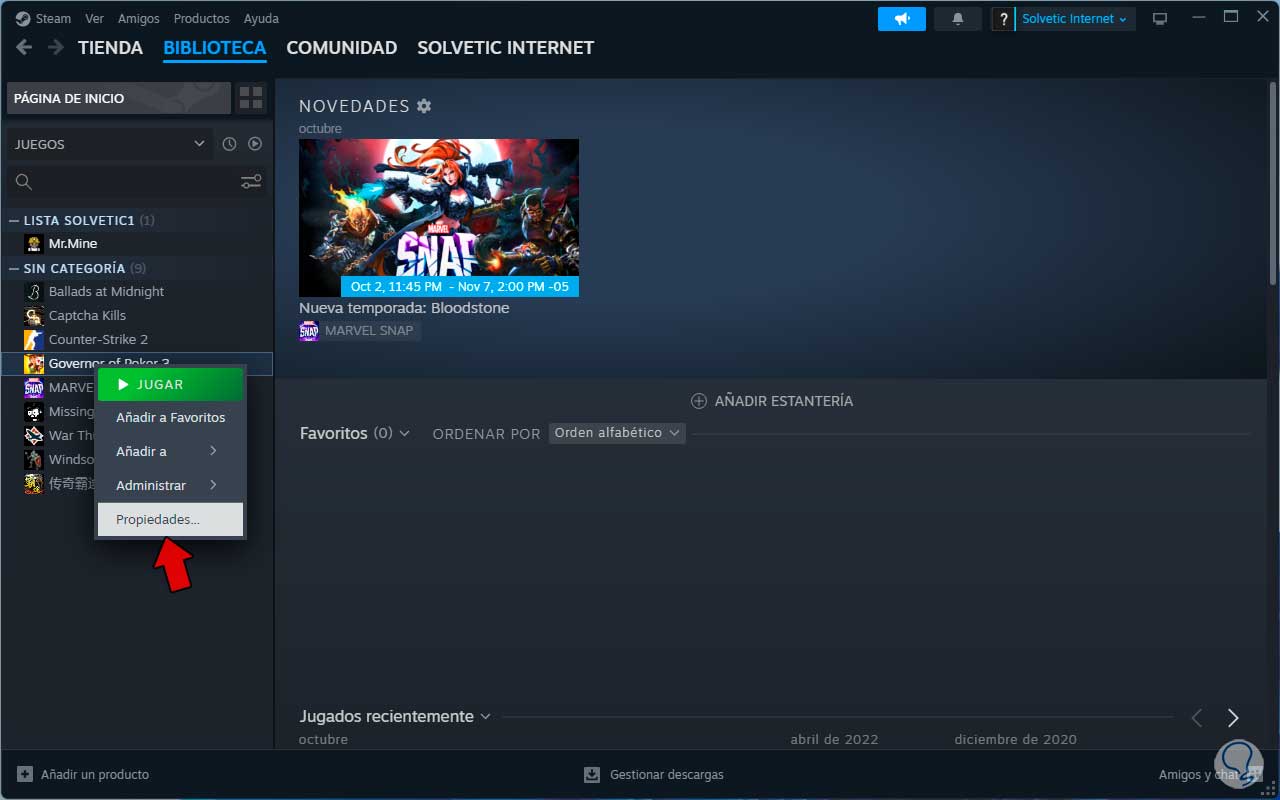 Sin lugar a dudas que un error que afecta directamente a Steam Cloud es un juego con error, Steam nos ofrece la posibilidad de revisar la integridad del juego para determinar si el fallo es allí, abrimos Steam, damos clic derecho sobre el juego y pulsamos en “Propiedades”: