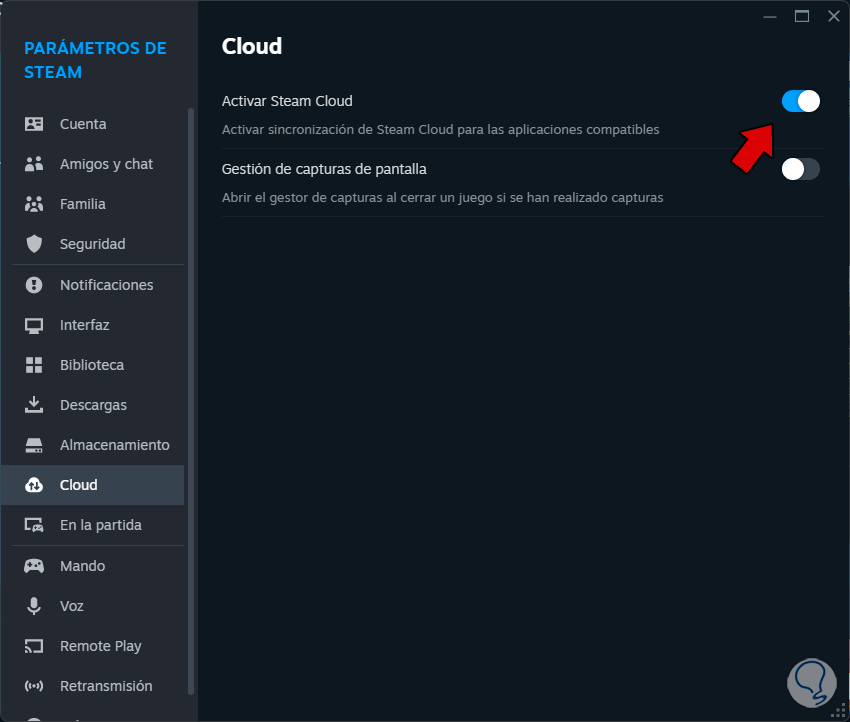 Aquí vamos a validar que el interruptor “Activar Steam Cloud” se encuentre habilitado.