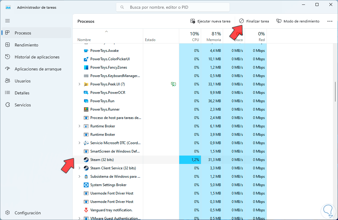 En el Administrador ubicamos el proceso de Steam: