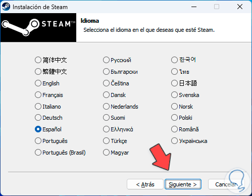 Damos clic en “Siguiente” para elegir el idioma de instalación: