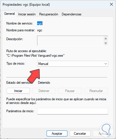Aquí, en el campo “Tipo de inicio” establecemos la opción “Automático”: