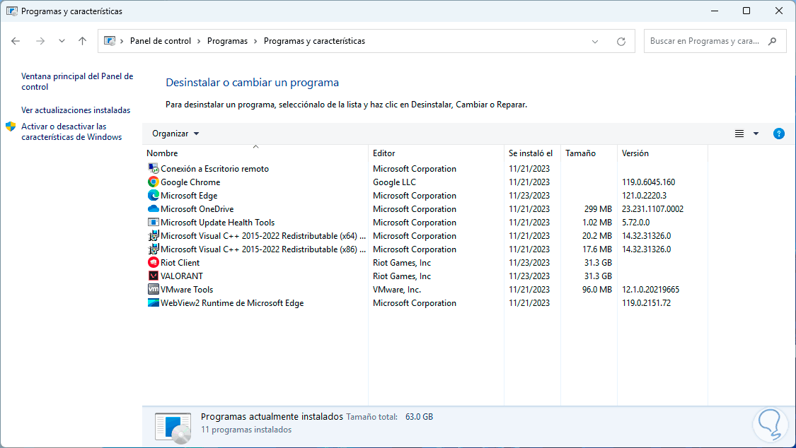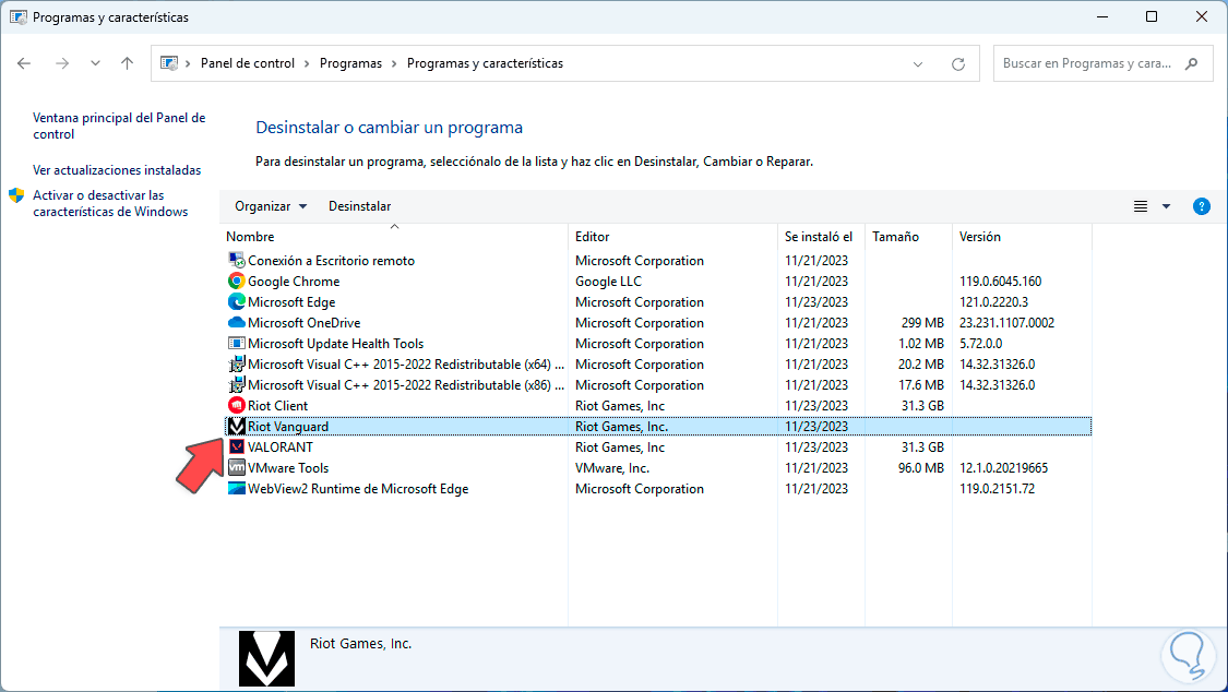 Cuando instalamos Valorant se instalan al tiempo complementos que ayudan a un optimo funcionamiento pero que en algún momento pueden afectar, para desinstalarlo, abrimos el Panel de control y damos clic en “Desinstalar un programa”: