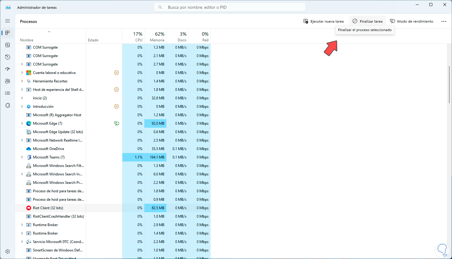 Luego vamos a seleccionar todos los procesos asociados a Valorant (como Riot Client):