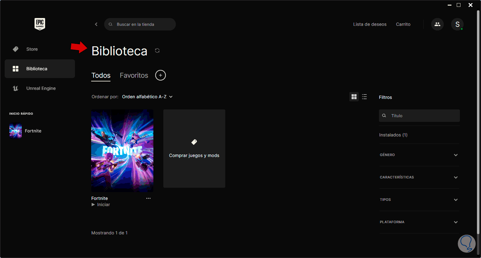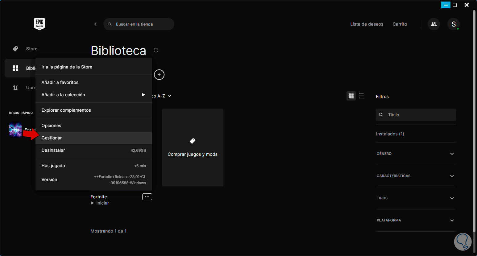 Tras esto, abrimos la aplicación de Epic Games, damos en el menú de Fortnite y seleccionamos “Gestionar”: