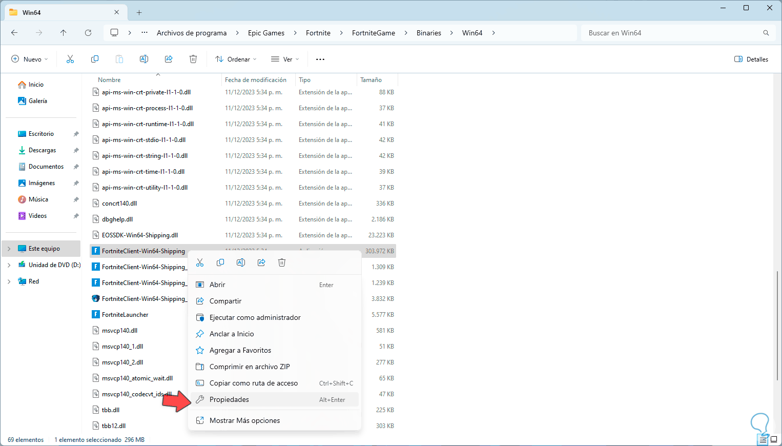 Allí, vamos a buscar los cuatro archivos ejecutables que tienen como nombre FortniteClient, damos clic en el primero y seleccionamos “Propiedades”: