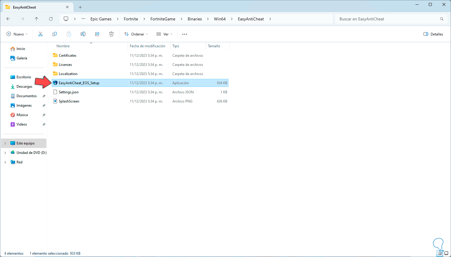 Allí seleccionamos y damos doble clic sobre el ejecutable llamado EasyAntiCheat_EOS_Setup, esto abrirá una ventana de consola por unos segundos para hacer el análisis en tiempo real y en segundo plano. Después de esto abrimos Epic Games desde el cuadro de búsqueda: