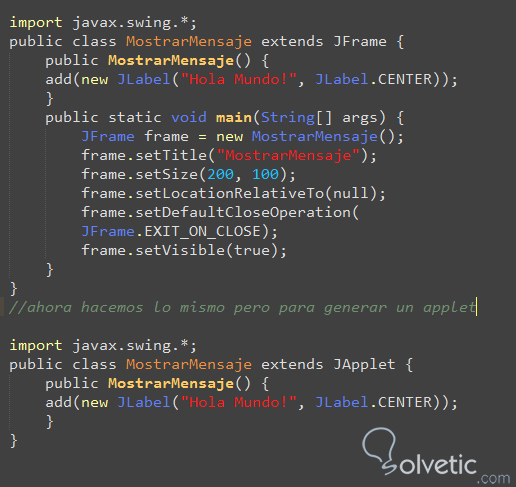 Vemos como inicialmente creamos una clase que hereda de JFrame y a la cual le añadimos una etiqueta o Label luego en el método main construimos el marco donde debe mostrarse todo esto, en la segunda sección de la imagen, hacemos exactamente lo mismo, solo que omitimos el método main y además en vez de heredar de JFrame heredamos de JApplet , esto nos da un set de herramientas que construye los contenedores de forma automática.