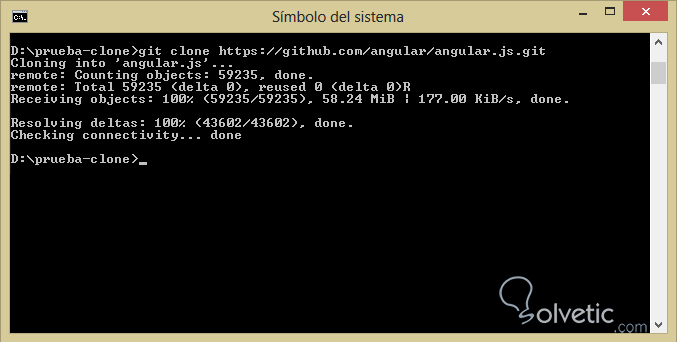 Otra forma de crear un repositorio es clonando un repositorio existente, usualmente los podemos conseguir en GitHub, para lograrlo debemos hacer uso del comando git clone seguido de la ruta del repositorio, esta puede ser local o remota, vamos a utilizar como ejemplo el repositorio del popular framework Javascript llamado Angular JS de Google: