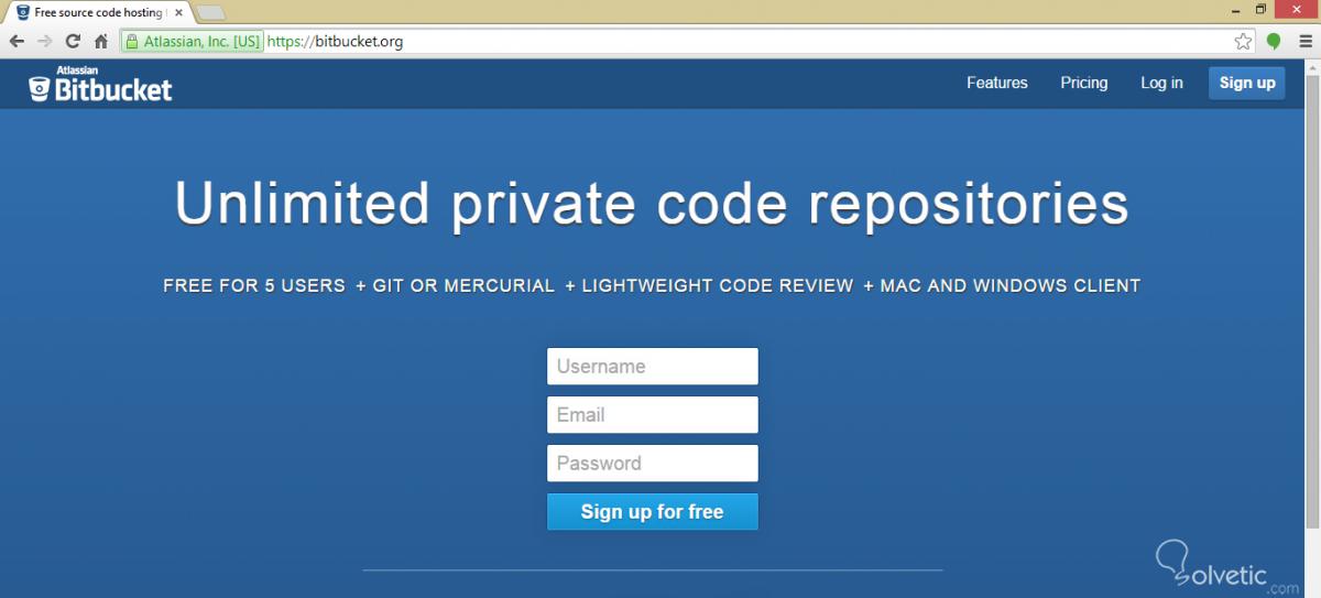 El segundo es Bitbucket, no es tan popular como GitHub, sin embargo es muy útil, tiene también una versión gratuita, pero la diferencia es que no es una comunidad abierta, por lo que podremos tener repositorios privados y públicos, adicionalmente en la versión gratuita podemos tener hasta 5 usuarios por repositorio creado.