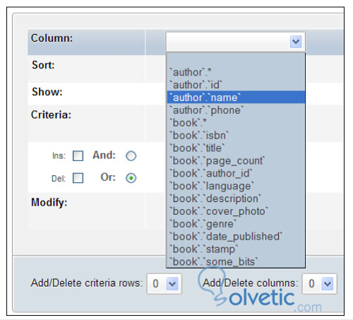 En la sección Column Criteria, tendremos disponibles todas las columnas de las tablas seleccionadas, podemos seleccionar los campos individualmente por cada tabla o simplemente seleccionarlos todos utilizando la opción terminada en.* por cada tabla representada, veamos como luce este selector.