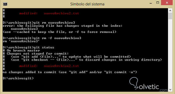 Veamos en el siguiente ejemplo como funciona cuando lo aplicamos sobre un archivo, en este caso vamos a volver a añadir nuevoArchivo3 con git add y luego aplicaremos sobre este git rm: