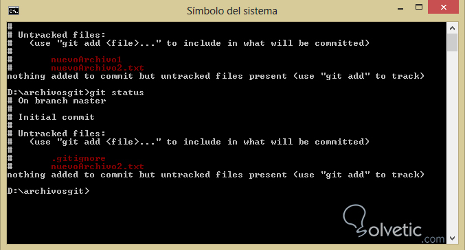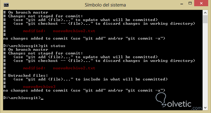 Notamos que el archivo nuevoArchivo3 que habíamos añadido a nuestro repositorio ahora no está y tiene la clasificación untracked.