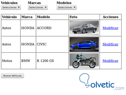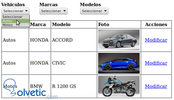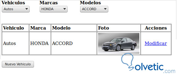 Al ejecutar quedará el select cargado con los vehÍculos: