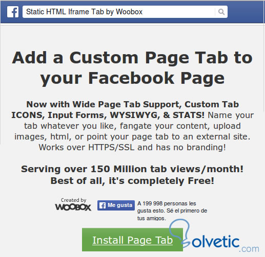 A continuación nos presentara la pantalla de de instalación donde tendremos la opción para añadir una pestaña a nuestra pagina de Facebook. La aplicación esta en ingles por defecto, pero no es compleja.