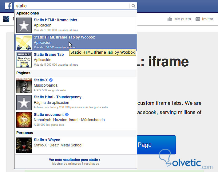 El objetivo de de la Landing Page es mostrar información directa sobre lo que ofrecemos sin distraer al visitantes, el objetivo principal sera que el visitante haga clic en el botón Me Gusta, compre el producto o se de de alta en un boletín de novedades. Además con el componente Static HTML Iframe Tab by Woobox podremos crear pestañas para añadir subpaginas o instalar distintas aplicaciones como canales de youtube, galerías de fotos, formularios de contacto para que nuestros visitantes interactúen. Situados en la fan page recién creada vamos a la zona de búsqueda y escribimos el nombre de la aplicación que queremos instalar en este caso Static Html y se desplegara un listado con las aplicaciones disponibles para seleccionarlas y luego configurarlas.