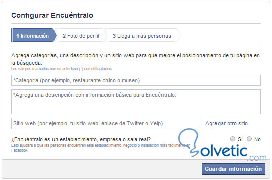 Luego nos presentara la pantalla de configuración para detallar la categoría, una descripción de la pagina que estamos creando para informar al publico de que se trata la página. Tambien podemos añadir el dominio del sitio web si lo tuviésemos.