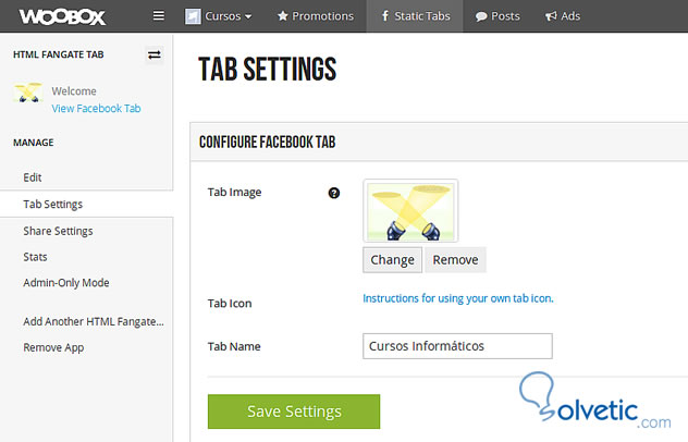 Accediendo a Tab Settings configuraremos el nombre de la pestaña, una imagen o icono si deseamos.