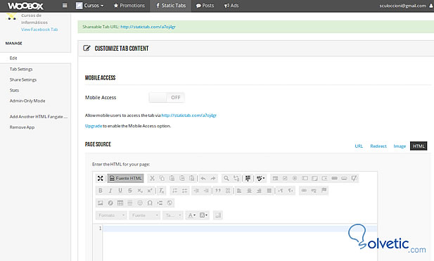 Nos solicitara el cambio de modo fan page o modo perfil y la aplicación nos solicitara acceder a algunos permisos como poder conocer nuestro email y conocer las estadísticas de la aplicación pero la aplicación no podrá publicar en facebook. Luego accederemos a la pantalla de la aplicación donde podremos cambiar el nombre de la pestaña Welcome y configurar las demás opciones además de diseñar la web desde un entorno amigable y visual.