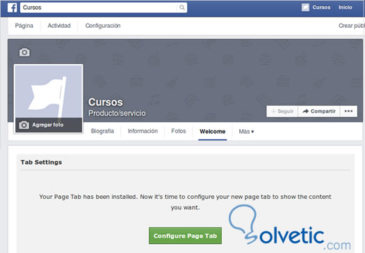 Si damos click sobre la imagen donde se instalo la aplicación accederemos a la pagina o pestaña que se colocara en el menú superior. Debajo del menú encontraremos el botón Configure Page Tab o Configurar pagina pestaña, que nos permitirá configurar y modificar las opciones de la pestaña.