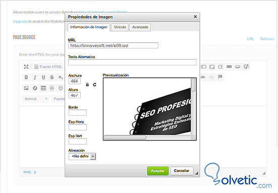 Como podemos ver el editor tiene algún parecido con Wordpress o algunas web donde se escriben artículos, es un editor con en entorno WYSIWYG para crear la pagina en forma visual o bien para programador mas avanzados utilizar como editor de HTML.